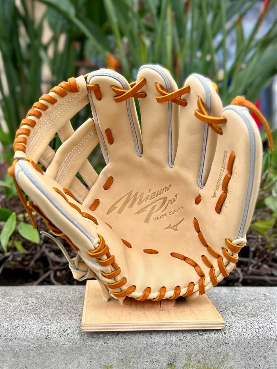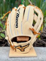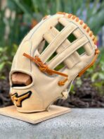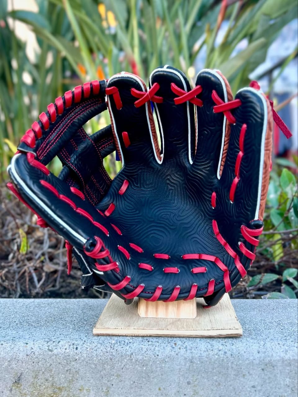 BLACK AND BROWN PREMIUM STEERHIDE LEATHER, SPLIT GREY WELTING, RED PRO LACE, RED STITCHING, 3D MOLDED RED MIZUNO RUNNING BIRD | FEATURES TOPOGRAPHIC EMBOSSED LEATHER