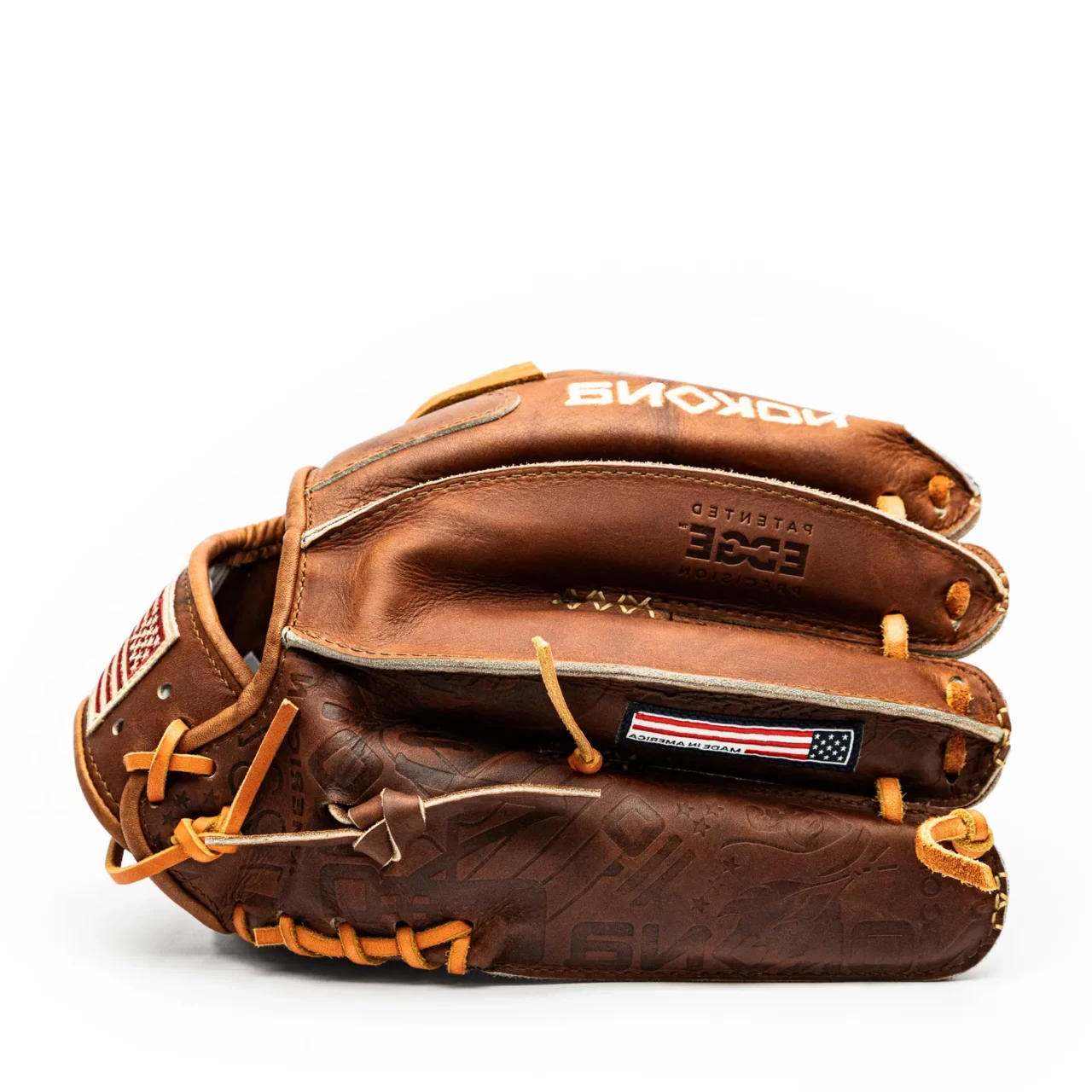 BUILDING UPON THE ENORMOUS SUCCESS OF NOKONA’S WALNUT SERIES GLOVES, THE EDGE PRECISION GLOVES TAKE STYLING TO THE NEXT LEVEL WITH CUSTOM STAMPING ALONG THE PINKY & RING FINGER, AND PROUDLY DISPLAY A UNIQUE AMERICAN FLAG PATCH SEWN WITH HERITAGE GOLD THREAD.