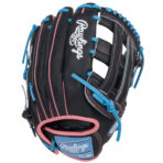 COLOR: NAVY BLUE STEERHIDE LEATHER, PINK WELTING & BINDING, COLUMBIA BLUE PRO LACE, PINK STITCHING, WHITE EMBROIDERY, WHITE ON COLUMBIA BLUE RAWLINGS PATCHES